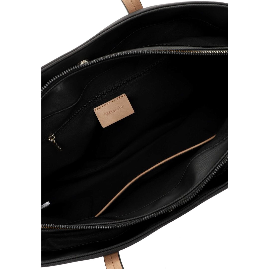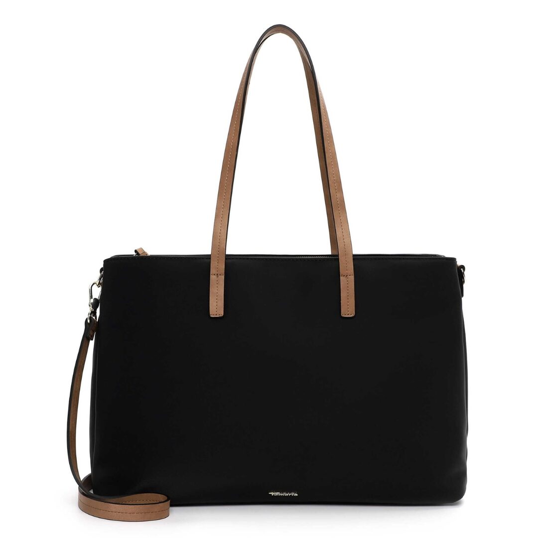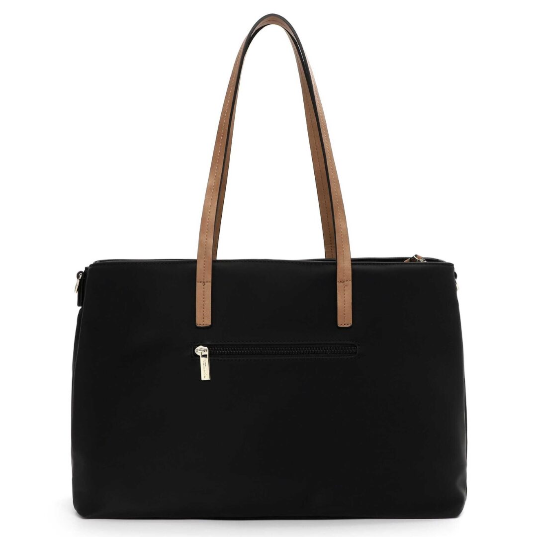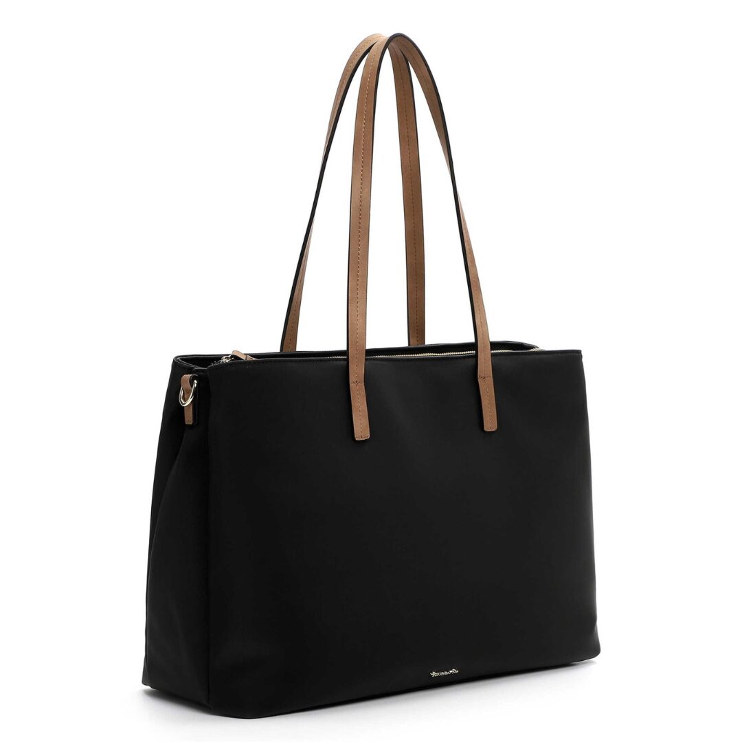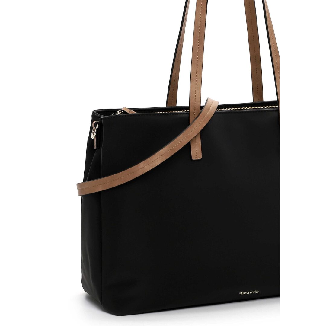Стилна и функционална дамска чанта Tamaris, изработена от висококачествена еко кожа в класическо черно с контрастни кафяви дръжки. Моделът впечатлява с изчистен и елегантен дизайн, подходящ както за офиса, така и за ежедневието. Просторното вътрешно отделение и дългата регулируема презрамка осигуряват удобство и практичност през целия ден.