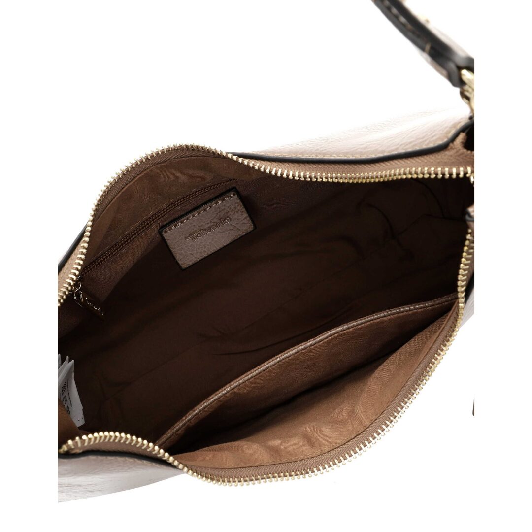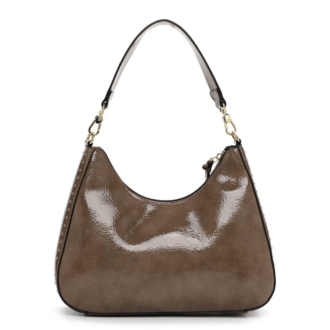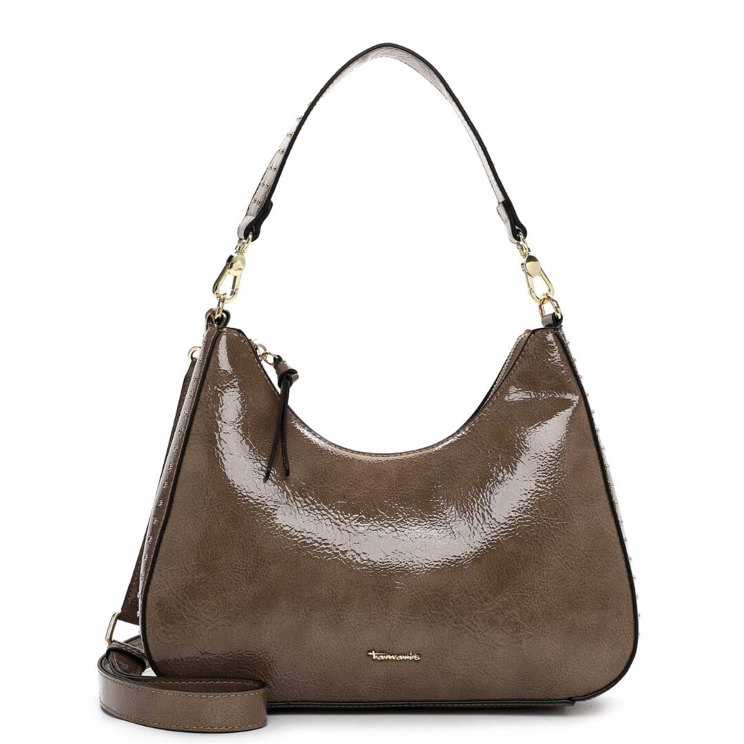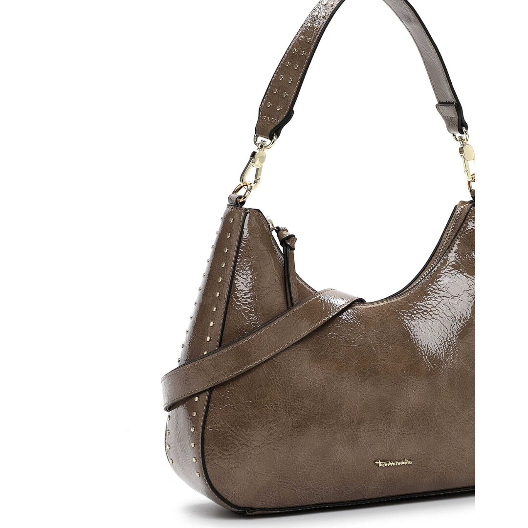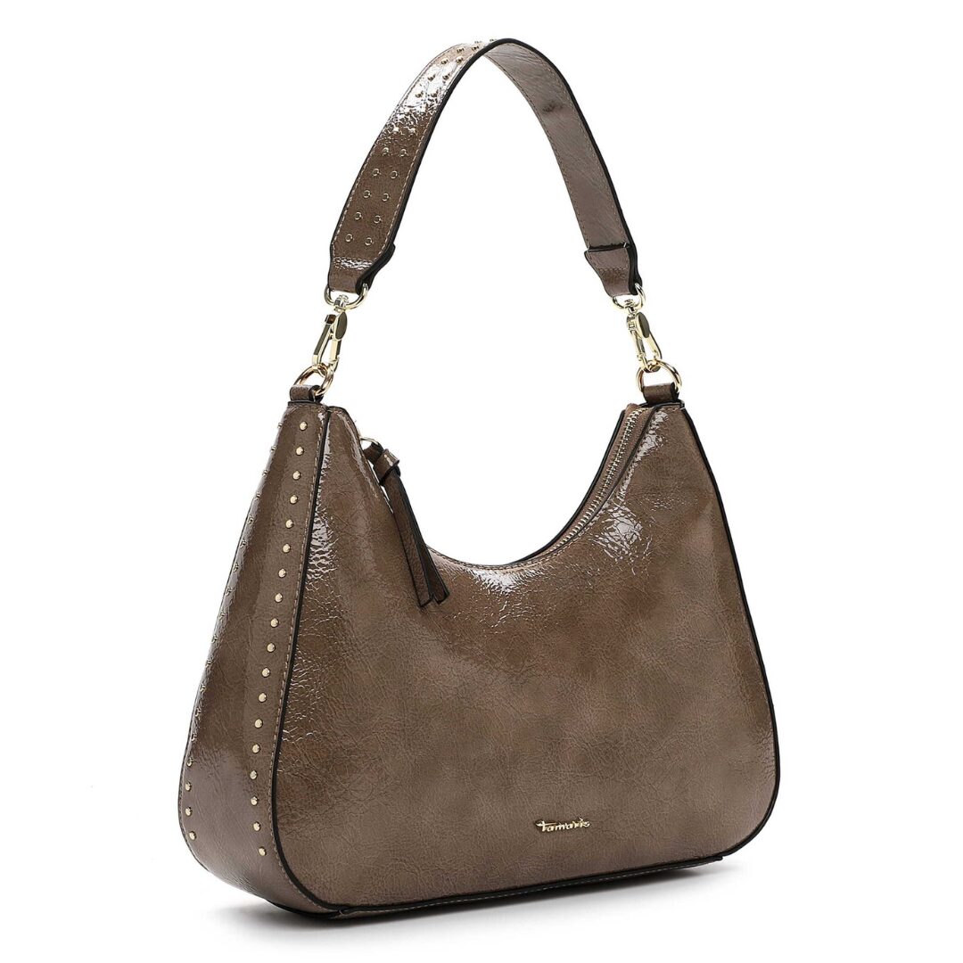 Елегантна дамска чанта Tamaris в красив кафяв нюанс с лек гланцов ефект. Моделът впечатлява с модерна форма и декоративни капси по дръжката и страничните линии. Изработена от висококачествена еко кожа, тя съчетава стил и практичност, подходяща както за ежедневието, така и за специални поводи.
