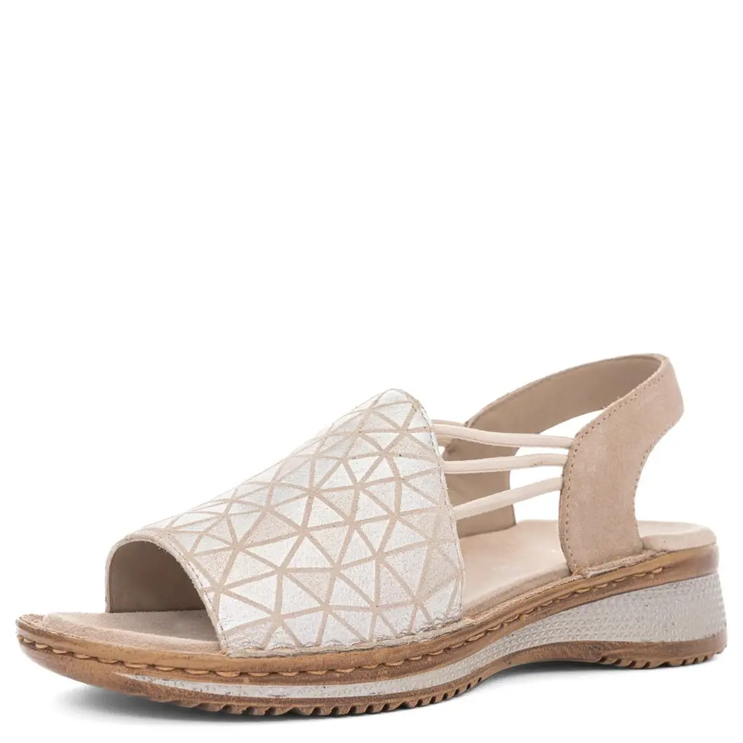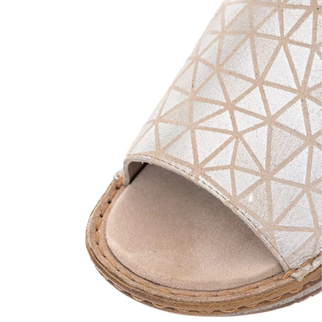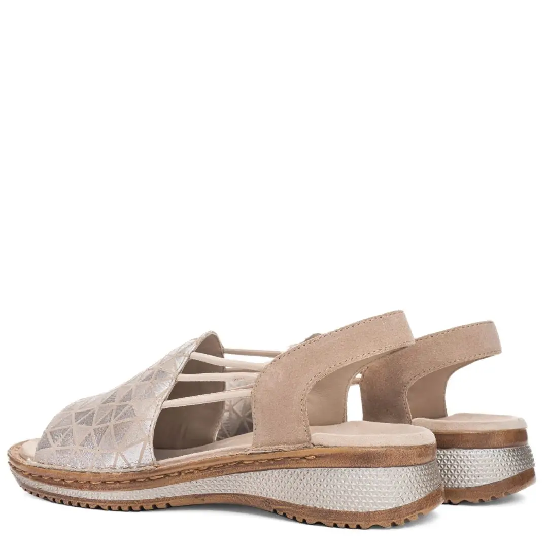Тези стилни дамски сандали на ARA са създадени с мисъл за активната жена, която търси максимален комфорт и модерна визия. Светлият неутрален цвят с лек сатенен отблясък и геометричен принт придава елегантност, която се съчетава лесно с всяко лятно облекло.