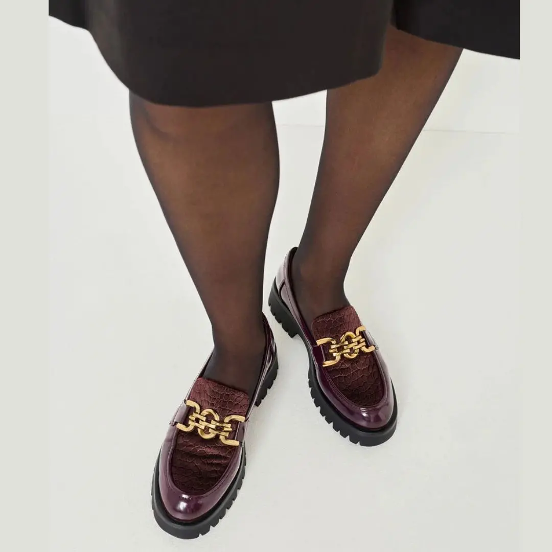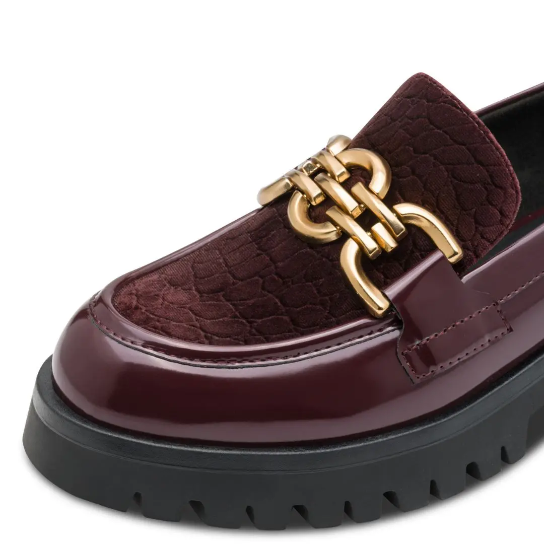 Вътрешната част, съставена от еко кожа и текстил, осигурява комфорт и приятно усещане през целия ден. Масивната декоративна златиста верига отпред добавя луксозен акцент и завършва модела с усещане за елегантност.