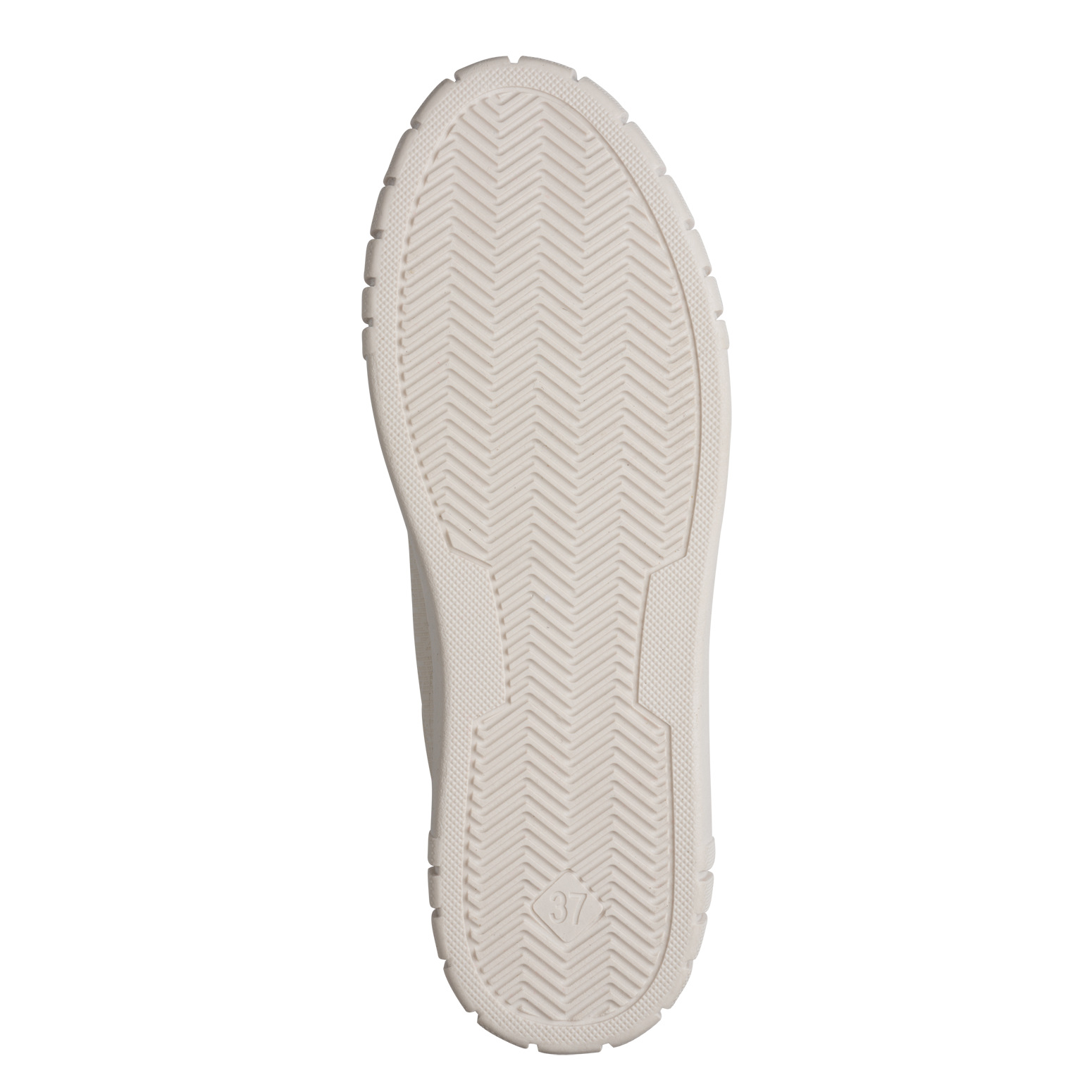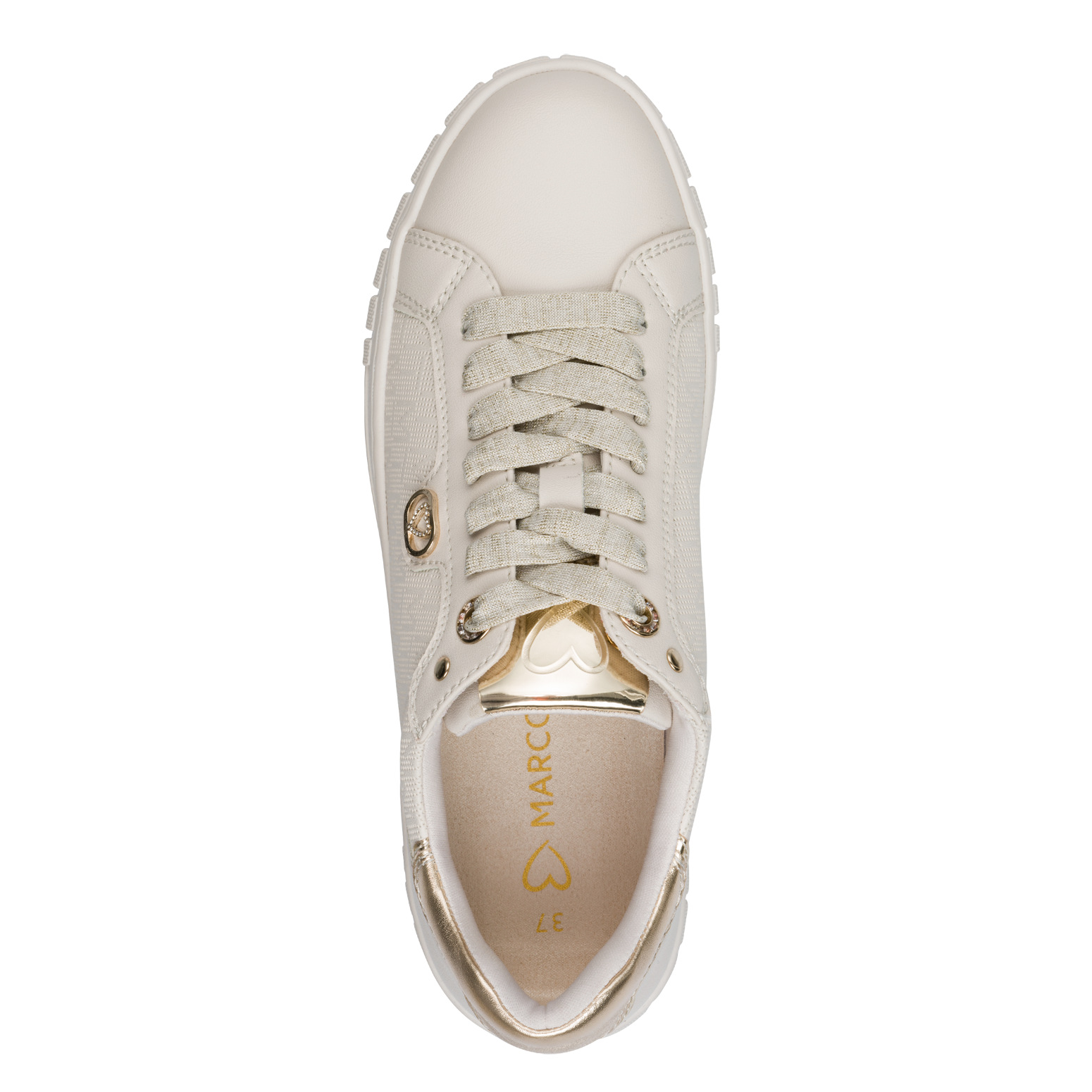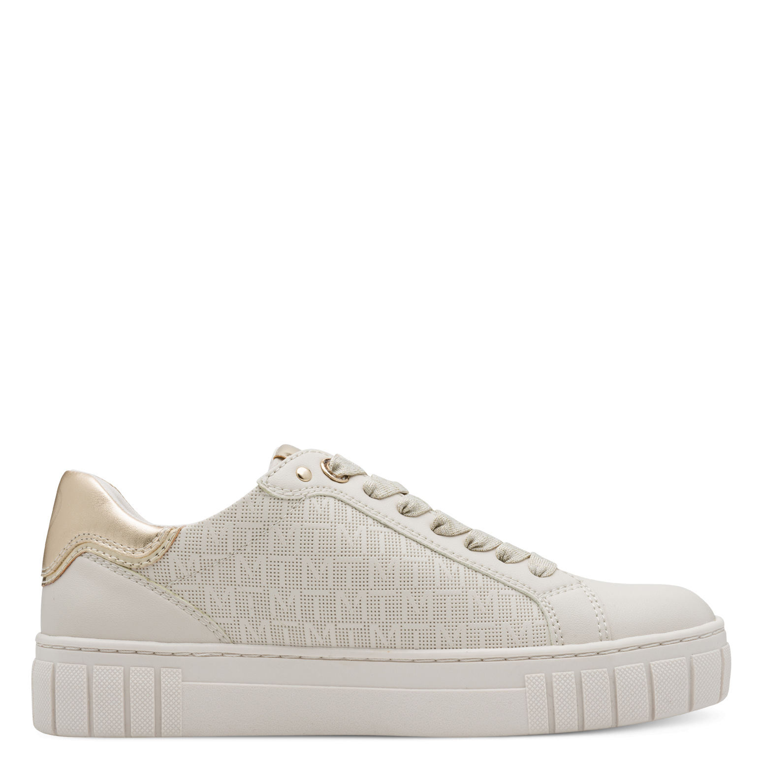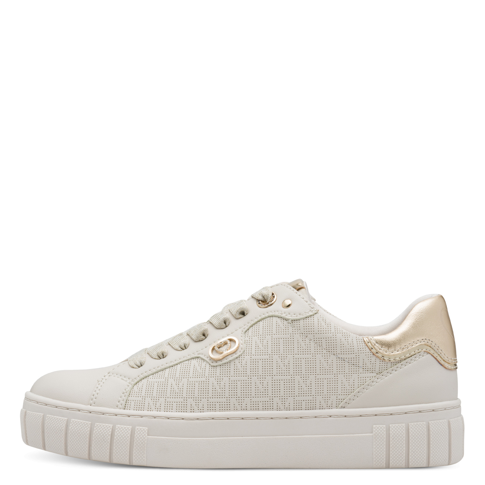 Стъпвайте със стил всеки ден с тези изключително модерни дамски кецове Marco Tozzi в елегантен кремав нюанс, съчетан със златисти акценти за изискано излъчване. Релефният монограм придава уникалност, а металните елементи добавят нотка блясък.