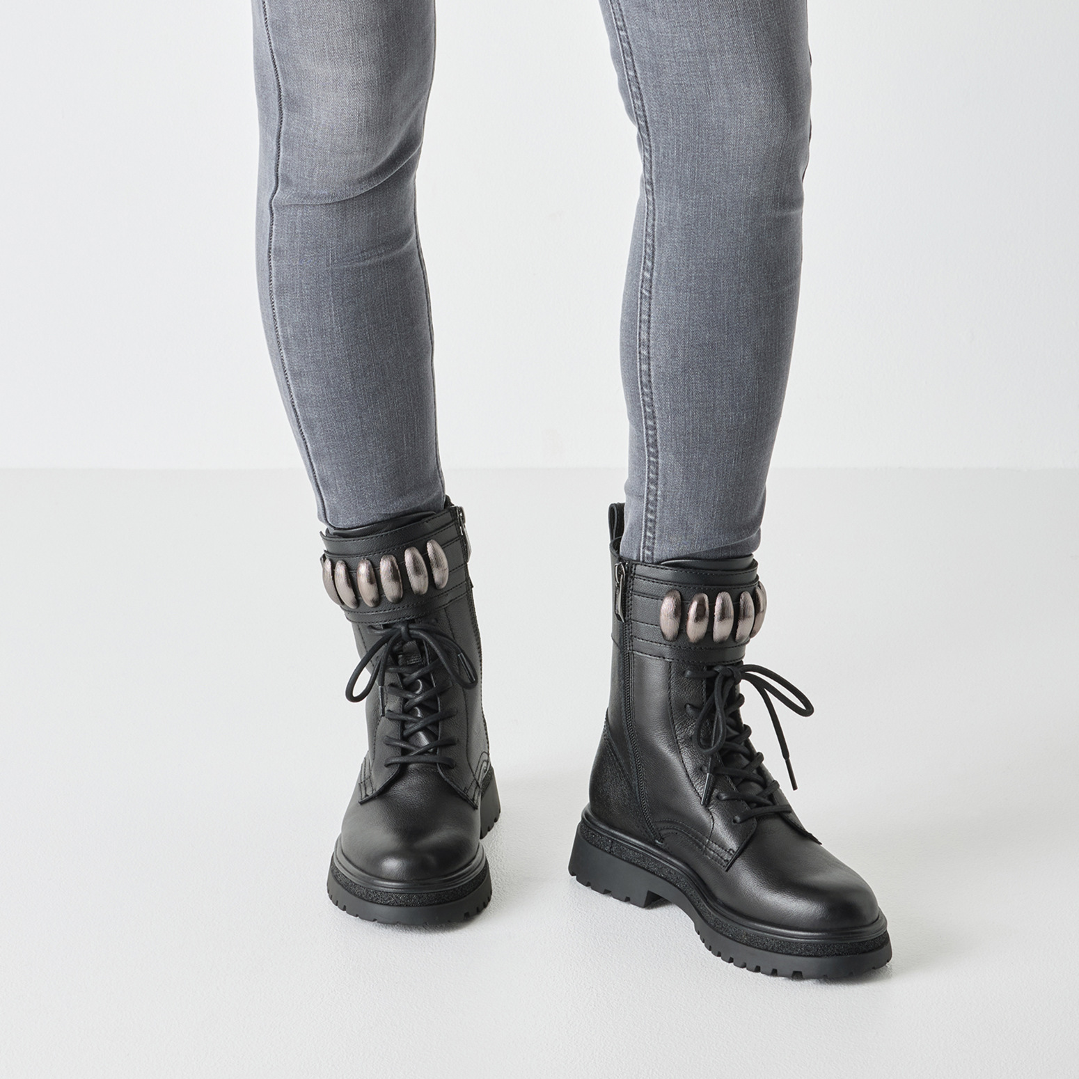 Подметката е стабилна и устойчива, с височина 4 см, гарантираща сигурност и комфорт при ходене. Практичният страничен цип улеснява обуването, а декоративният колан с метални елементи придава модерен и характерен завършек на визията.